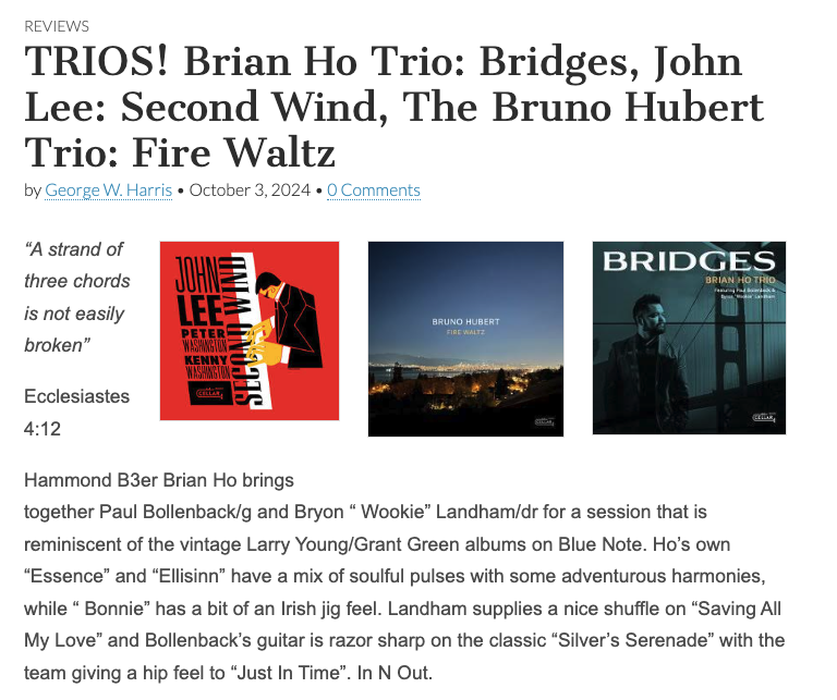 ” Hammond B3er Brian Ho brings together Paul Bollenback/g and Bryon “ Wookie” Landham/dr for a session that is reminiscent of the vintage Larry Young/Grant Green albums on Blue Note. Ho’s own “Essence” and “Ellisinn” have a mix of soulful pulses with some adventurous harmonies…Landham supplies a nice shuffle on “Saving All My Love” and Bollenback’s guitar is razor sharp on the classic “Silver’s Serenade” with the team giving a hip feel to “Just In Time”.” – Jazzweekly, October 2024